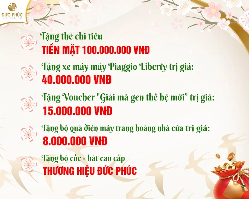 - Tặng Voucher “Giải mã gen thế hệ mới & Phát hiện 100% nguyên nhân gây vô sinh hiếm muộn” thăm khám trực tiếp với PGS.TS Trần Đức Phấn (Chủ tịch hội Di truyền Y học Việt Nam) 15.000.000 vnđ